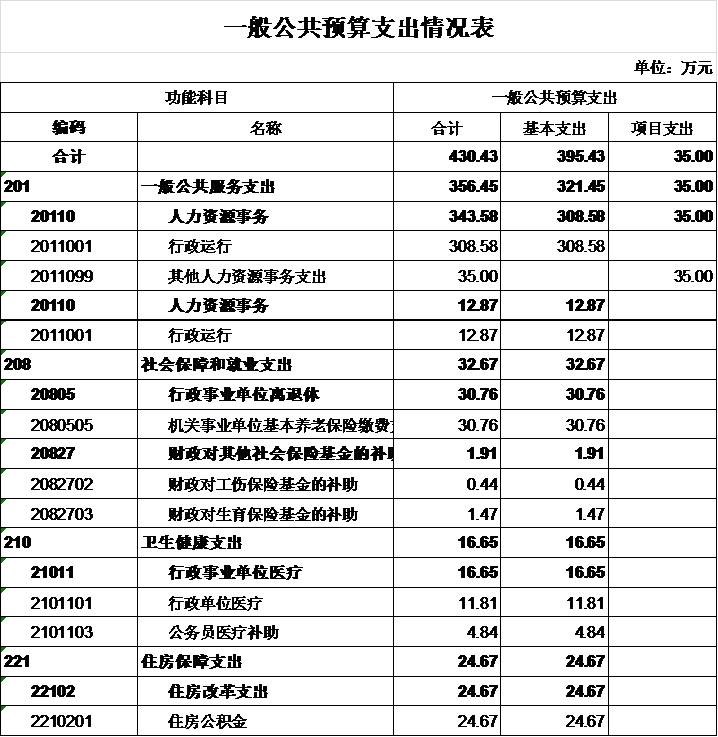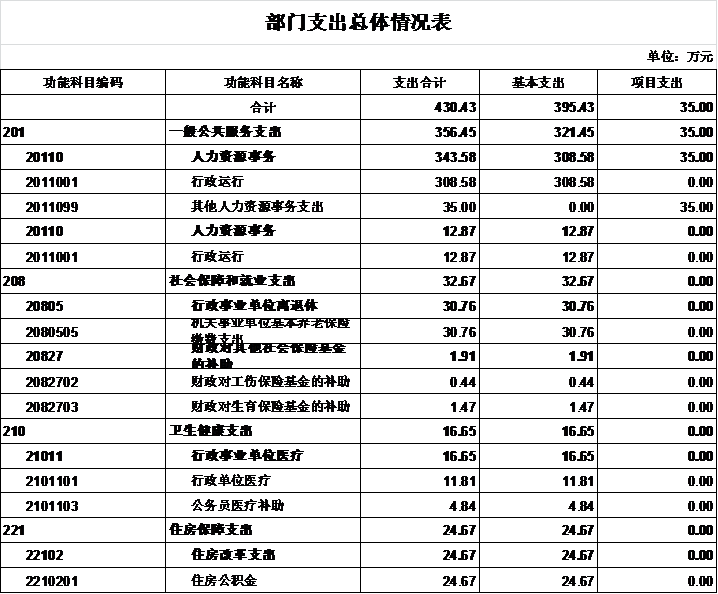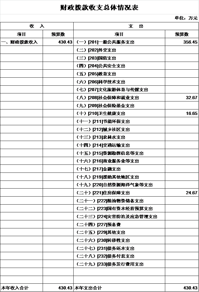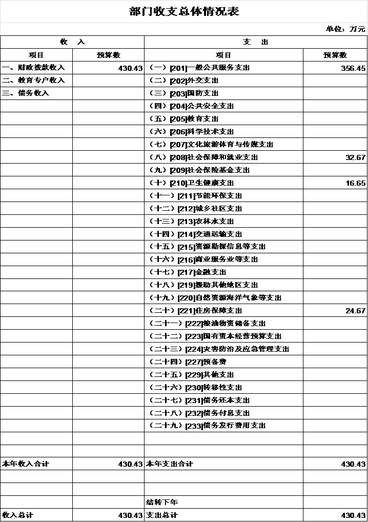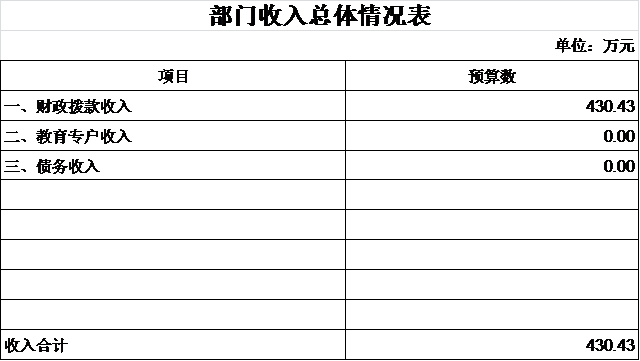 2019年部门预算收入总计430.43万元,比上年年初预算增加115.19万元,增加36.54%,其中:财政拨款收入430.43万元,教育收费收入0万元。相应地,部门预算支出安排430.43万元,比上年预算增加115.19万元,增加36.54%。其中:基本支出预算395.43万元,项目支出预算35.00万元。