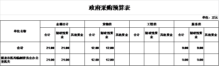 2019年政府采购预算21.00万元,财政性资金21.00万元,其他资金0万元,其中:货物类采购预算12.00万元,财政性资金12.00万元,采购项目主要是购买台式计算机、打印机、照相机、碎纸机、办公家具、打印纸及电脑耗材等办公用品;工程类采购预算无;服务类采购预算9.00万元,财政性资金9.00万元,采购项目主要是印刷服务及机票采购服务。