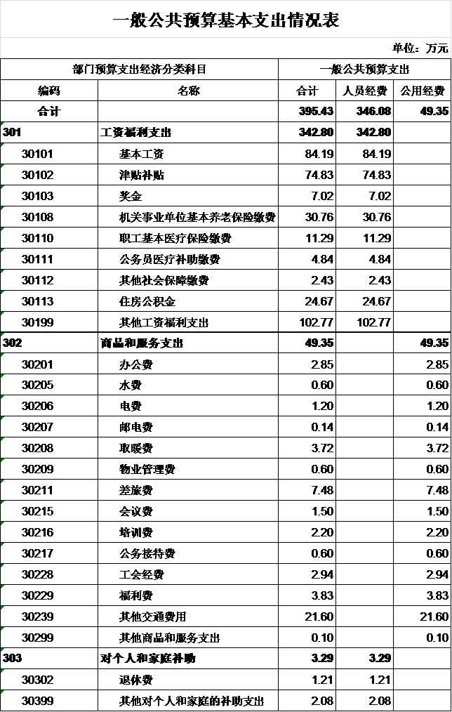(1)基本支出:2019年一般公共预算财政拨款基本支出 395.43万元,与2018年280.24万元相比,增加115.19万元,增加41.10%。增加的原因:一是部门人员增加及调资等因素,增加了工资福利支出;二是机关事业单位基本养老保险单位缴费纳入财政预算(2018年未做预算)。